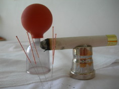 Bei der Akupunktur werden Nadeln an bestimmten Punkten des Körpers eingestochen, die dafür sorgen, dass der gestörte Harmoniefluss wieder hergestellt wird. Manchmal werden die Nadeln auch mit Moxazigarren erwärmt und Schröpfköpfe aufgesetzt. Neben der Akupunktur mit Nadeln setze ich auch einen Laser ein.